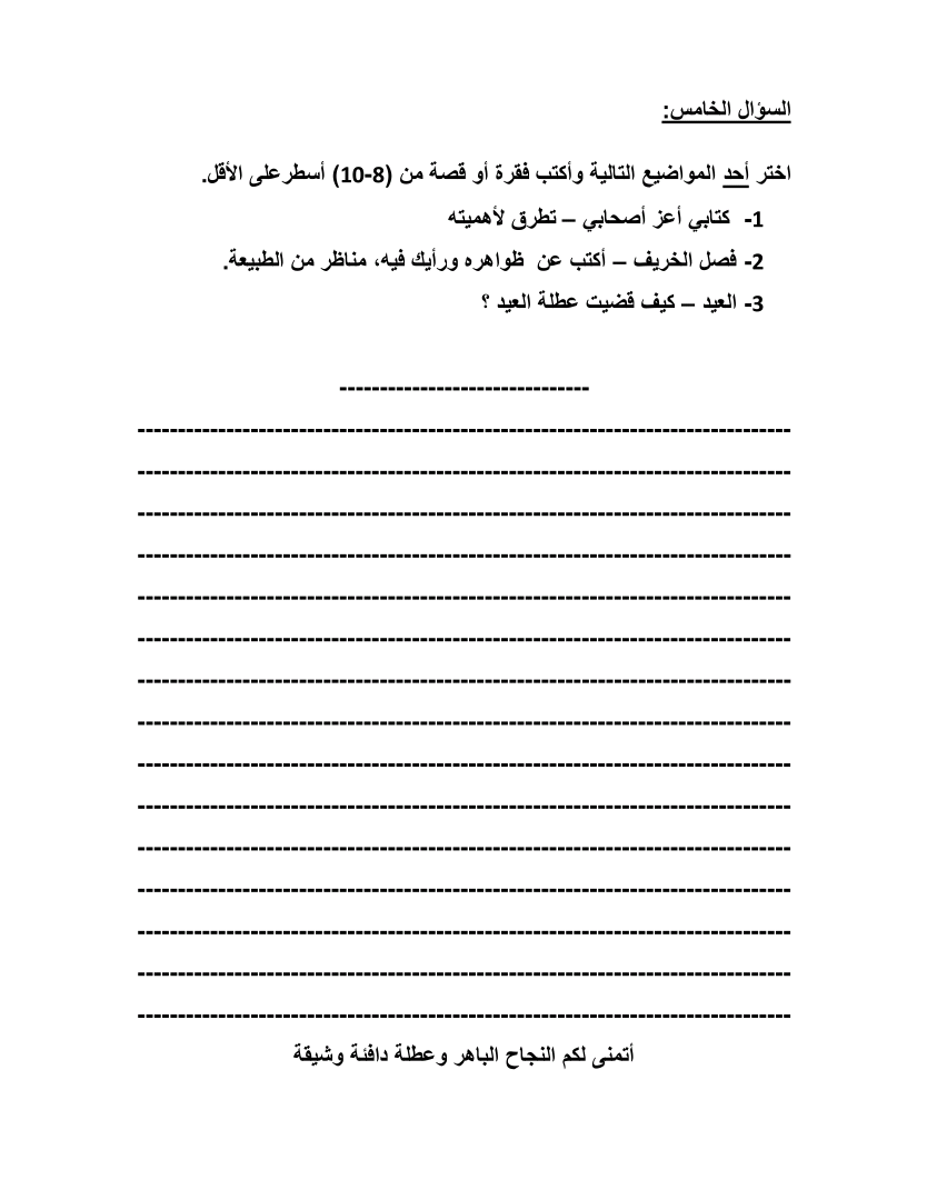 امتحان تعبير كتابي للصف الخامس. It s used for purifying the dirty water. سبحان م ن أبدع في خلقه فوازن الأرض والحياة وجعلها صالحة للعيش يختار الإنسان فيها أي مكان فيعيش فيه فأبدع في منظومة الكون والأرض فلا تختل صنع الله الذي أتقن كل شيء فكانت مجر ات. 005 الصف الخامس. الموضوعات الموجودة بالملف تشمل الكثير مثل موضوع تعبير عن حب الوطن موضوع تعبير عن السياحة موضوع تعبير عن الربيع موضوع تعبير عن النظافة وغيرها من موضوعات التعبير.